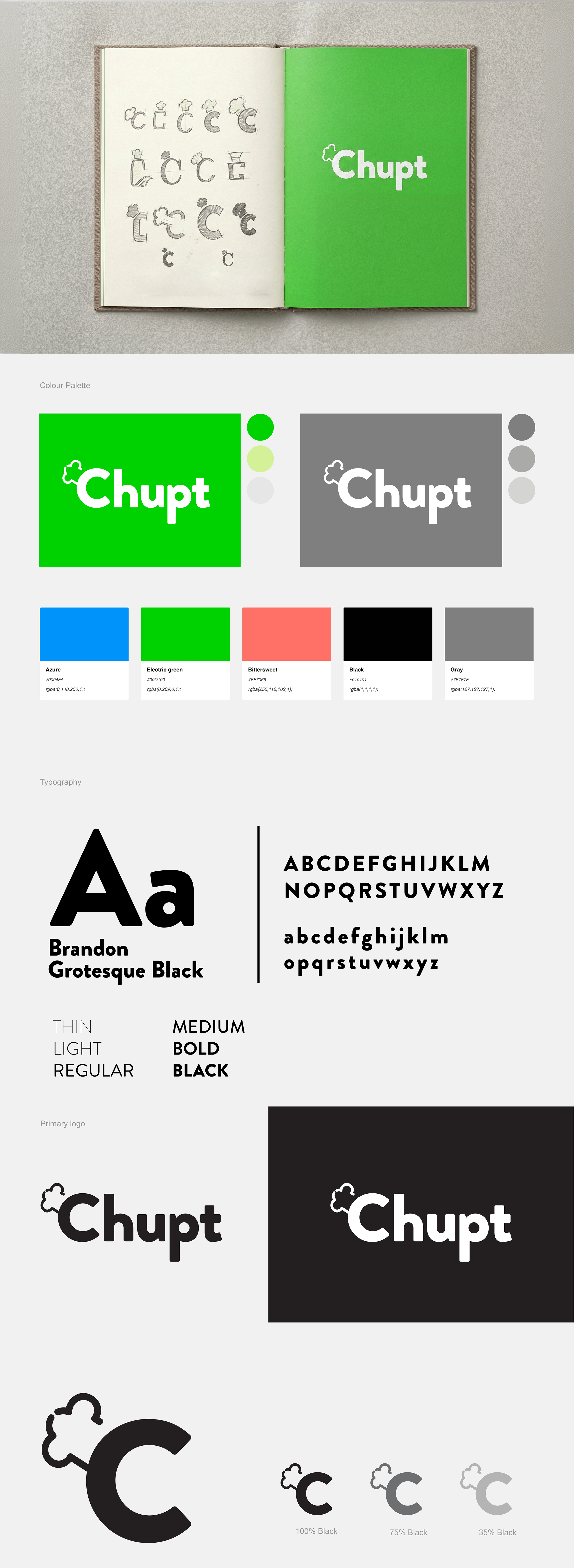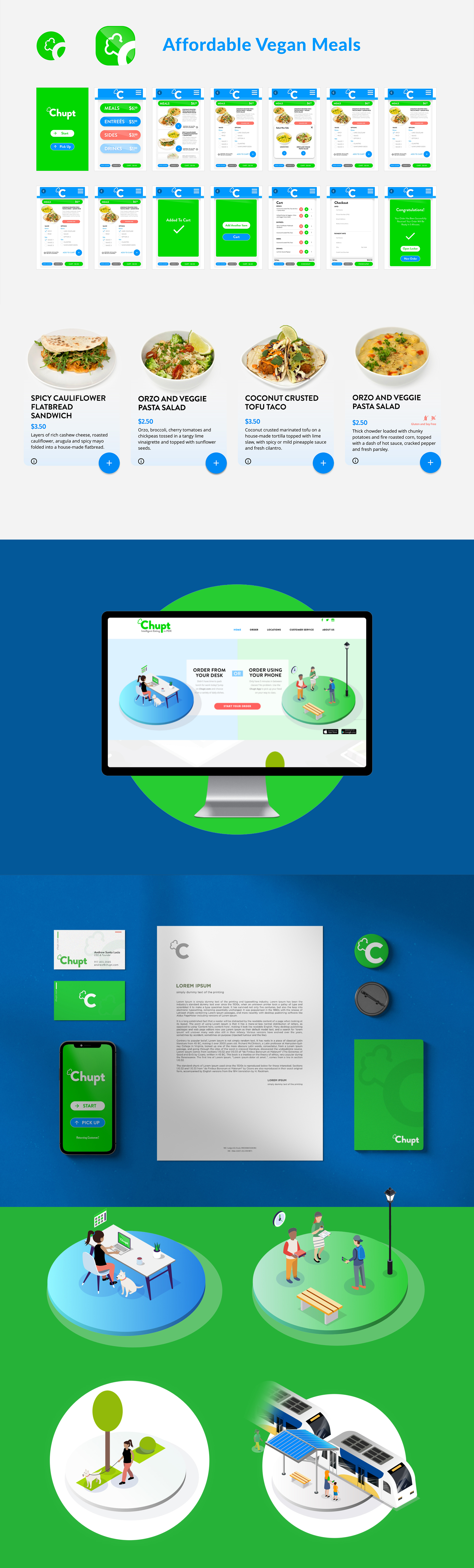 As a startup bridging the gap between food and technology, Chupt needed a comprehensive visual identity to establish their market presence. They required a timeless, elegant logo design and a complete suite of supporting brand materials optimized for both digital (RGB) and print (CMYK) applications. The brand needed to clearly communicate their unique value proposition—inexpensive, accessible vegan food, available whenever and wherever.